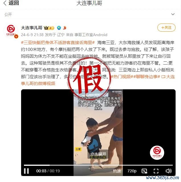 “三亚发布”推文称,6月9日,一段题为《三亚快艇把身体不适游客直接丢海里》的视频在网络上热传引发广泛关注。经核查,该视频内容失实。原视频首发于4月27日,其主要指出游客穿戴救生衣的不正确方式,并演示了正确穿戴救生衣的方法。