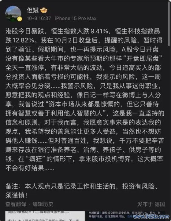 10月10日,但斌发文称:“我在10月2号提示风险,暂时得到验证。假期期间也一再提示风险……对普通百姓,千万不要把辛苦赚来存放在银行准备养老、治病、养孩子、供房子等的钱,在‘疯狂’的情形下,拿来股市投机博弈,这大概率不会有好结果。”