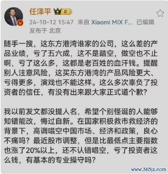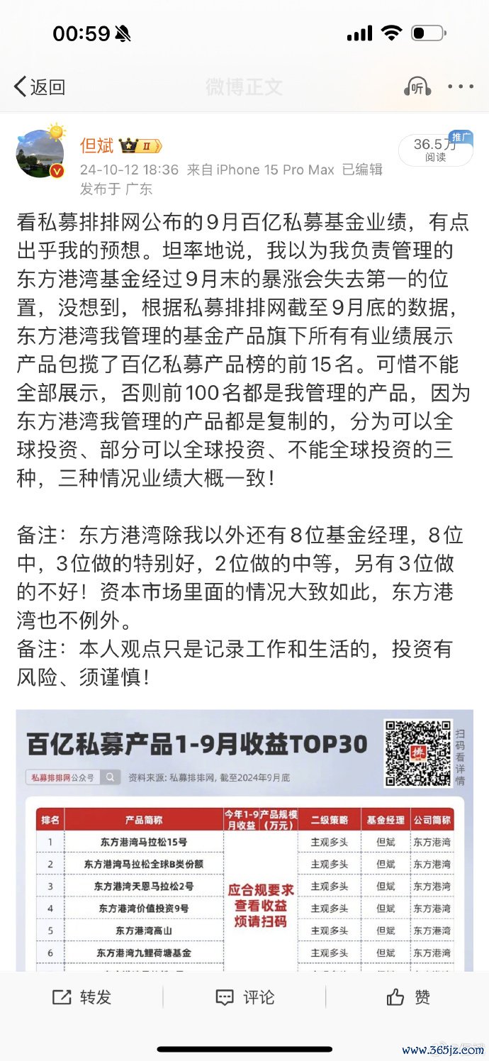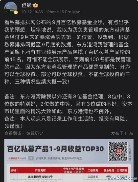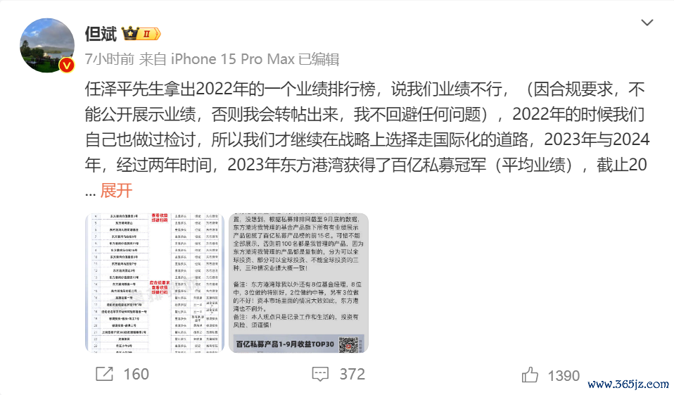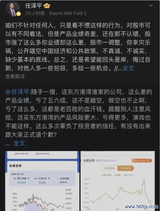 “任泽平先生拿出2022年的一个业绩排行榜,说我们业绩不行,(因合规要求,不能公开展示业绩,否则我会转帖出来,我不回避任何问题),2022年的时候我们自己也做过检讨,所以我们才继续在战略上选择走国际化的道路,2023年与2024年,经过两年时间,2023年东方港湾获得了百亿私募冠军(平均业绩),截止2024年1月至9月东方港湾依然是百亿私募冠军,我管理的150只基金(子母结构算一只),其中约100只可以全球投资的基金产品创出了历史新高,所有坚持持有的投资人都有收益,其余的50只净值也有一定的上涨幅度,东方港湾我管理的系列产品在各渠道也均居前列,所以他展示的图片,如果换成2024年情况大不同。另外,2021年市场不好以后,东方港湾所有产品,只要净值在1以下,我们都免收管理费,按合同规定能收取的也都不收,每年少收1亿元,我坚持认为给客户赚不到钱,应该分文不取。另外,本人在微博上从不删帖也从不拉黑任何人。以上三点,任泽平先生,均罔顾事实,肆意歪曲,没有一点经济学家的客观精神!与任先生的”交流“到此为止,清者自清……”