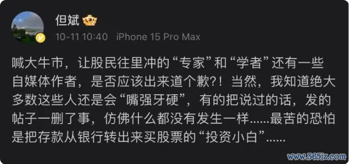10月11日,但斌多次表态自己提示过风险之后,开始不知名的批评,:喊大牛市,让股民往里冲的“专家”和“学者”还有一些自媒体作者,是否应该出来道个歉?