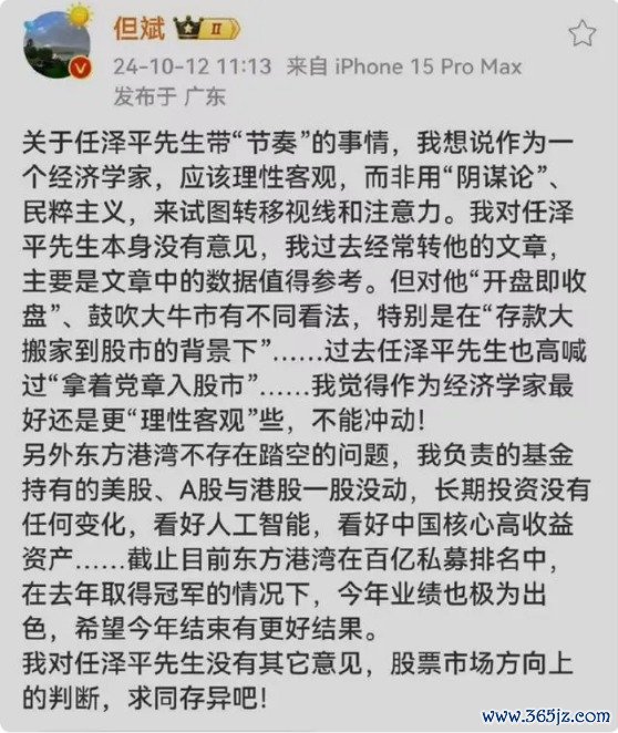 到了10月12日,但斌在微博发文,点名任泽平“带节奏”,他表示,作为一个经济学家,应该理性客观,而非用“阴谋论”、民粹主义,来试图转移视线和注意力。我对任泽平先生本身没有意见,我过去经常转他的文章,主要是文章中的数据值得参考。但对他“开盘即收盘”、鼓吹大牛市有不同看法,特别是在“存款大搬家到股市的背景下”……我觉得作为经济学家最好还是更“理性客观”些,不能冲动!