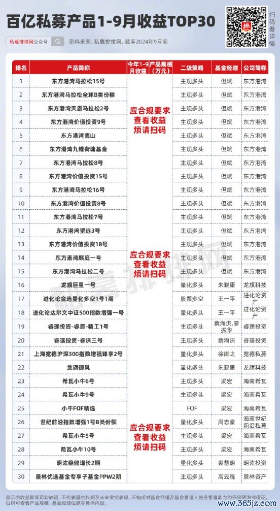 这份三方平台对前9个月的私募排名中,东方港湾包揽了业绩前15名,不过从16名到30名,既有龙旗、进化论、宽德、世纪前沿、明汯等量化私募多只产品入选,也有希瓦、景林等主观多头的产品。并不符合但斌所称“可惜不能全部展示,否则前100名都是我管理的产品”。